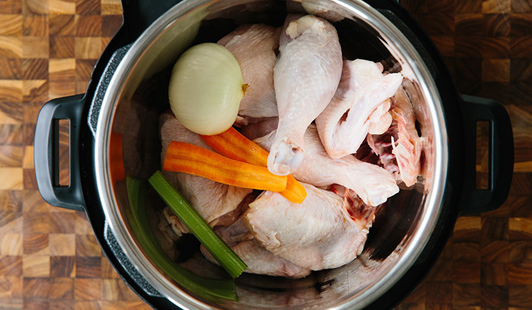 - Place your chicken and water in equal ratios in your Pressure Cooker if you want a mild glaze and a gravy feel. Use twice the amount of water if you want a Broth.