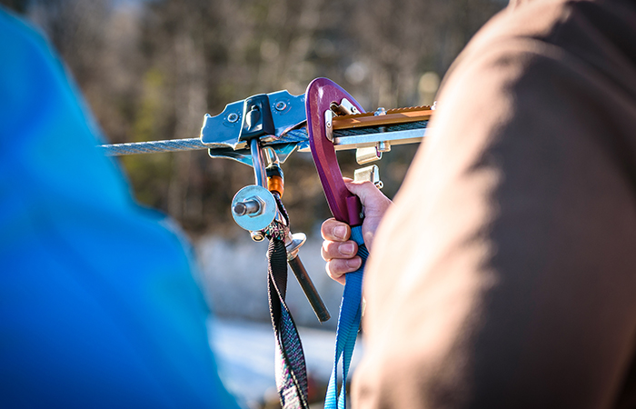 In order to stay safe while riding your zip line, there are a number of accessories you could use. You may see things such as kits that include handlebars to hang on to, or simple rope lanyards with a wooden seat at the end of it. However, these types of accessories tend to increase the risk of riding a zip line – so much so that adventure parks or other commercial businesses offering zip line rides use advanced equipment that increases safety by ensuring riders remain oriented facing the front of the zip line and are attached not only via a harness, but also have additional safety measures to prevent unhooking from any accessory while riding the zip line. Based upon these standards, here are some of the accessories you may want to consider: