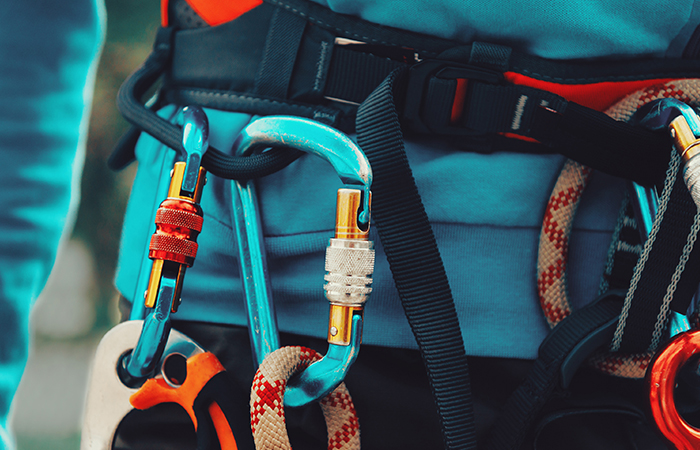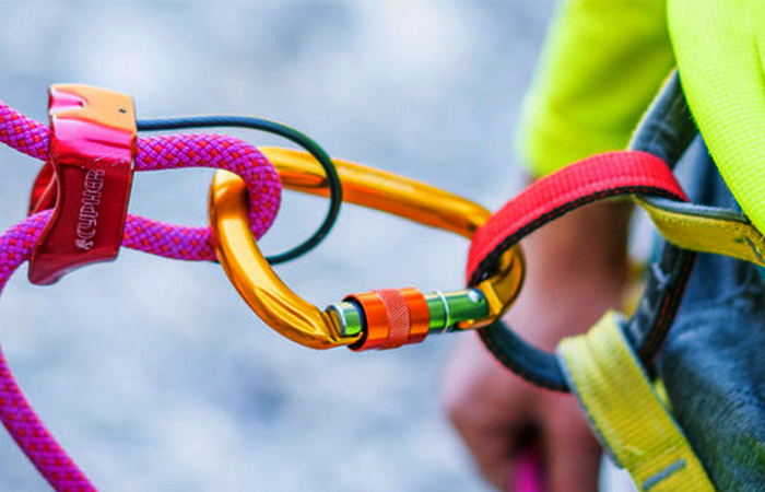 These gated attachment devices are a staple item in rock climbing and mountaineering. Consisting of a metal loop with a moveable, spring-loaded gate that allows ropes, cables or links to attach but not detach without compressing the gate down. There are now many different varieties of carabiners due to their usefulness in