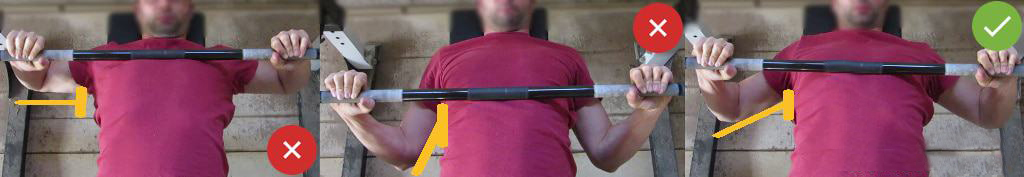 Your elbows should not be perpendicular to your torso. That way, you will impinge your chest. On the other hand, you also can’t tuck your elbows too much. Thus, it will make the weight way heavier to lift. Your elbows should be around 75° angled with your body. Tuck your elbows toward your torso slightly as you lower the bar and tuck away a little bit as you lift the bar.