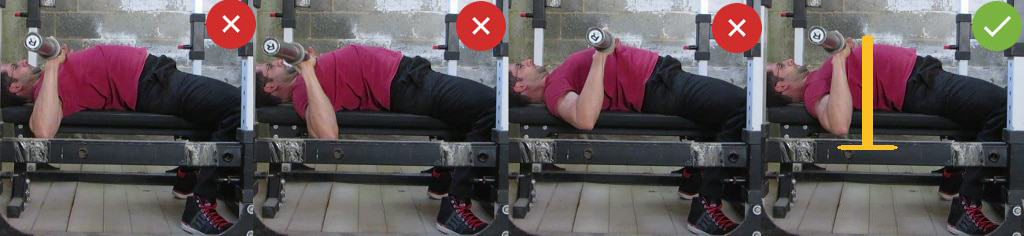 Don’t do bench press with a flat lower back. You should arch your lower back slightly up. That will help your upper back stretch. Don’t over arch your lower back though. Arch to that extent to which you can slide your hands between the weight bench and your lower back as depicted in the right side of the picture.