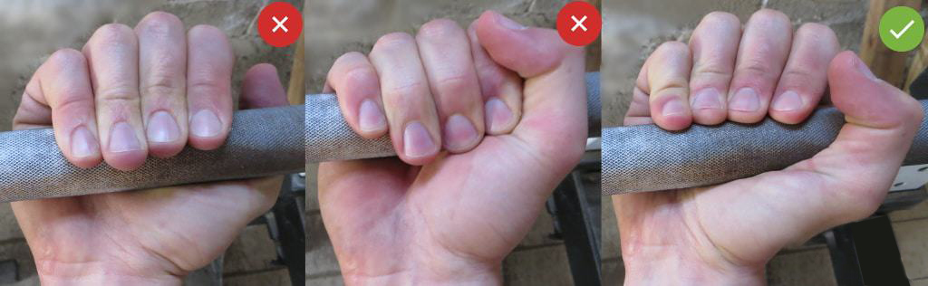 Don’t use a thumb less grip as depicted on the left side of the picture. With this grip, the bar can slip off anytime. Secure your grip by using your thumb. That way the bar won’t fall off your hands. However, don’t use a strong grip. Thus, your wrist will bend it will hurt in the long run. Practice the bulldog grip as depicted on the right side of the picture. It may feel insecure and awkward initially if you are not used to it. Try it for a few workouts and you will get used to it.
