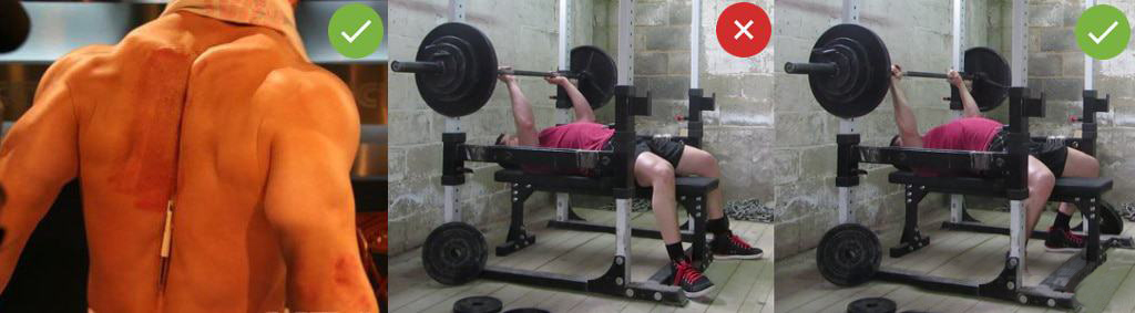 You should squeeze your shoulder-blades while bench pressing. That will stretch your upper back and enhance your stability. Don’t squeeze too hard though. Just imagine you are holding a pen gently with your shoulder blades as depicted in the picture above.